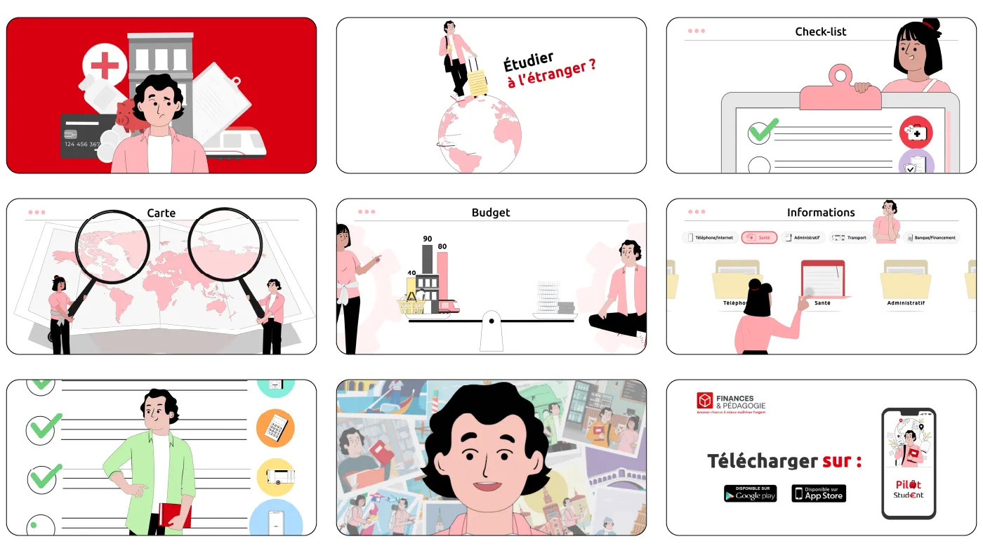 Conception d’une animation visuelle visant à introduire l'application de Finances & Pédagogie : PILOT STUDENT – L’appli pour bien gérer son projet à l’étranger, créées en collaboration avec des partenaires du secteur associatif et bancaire.